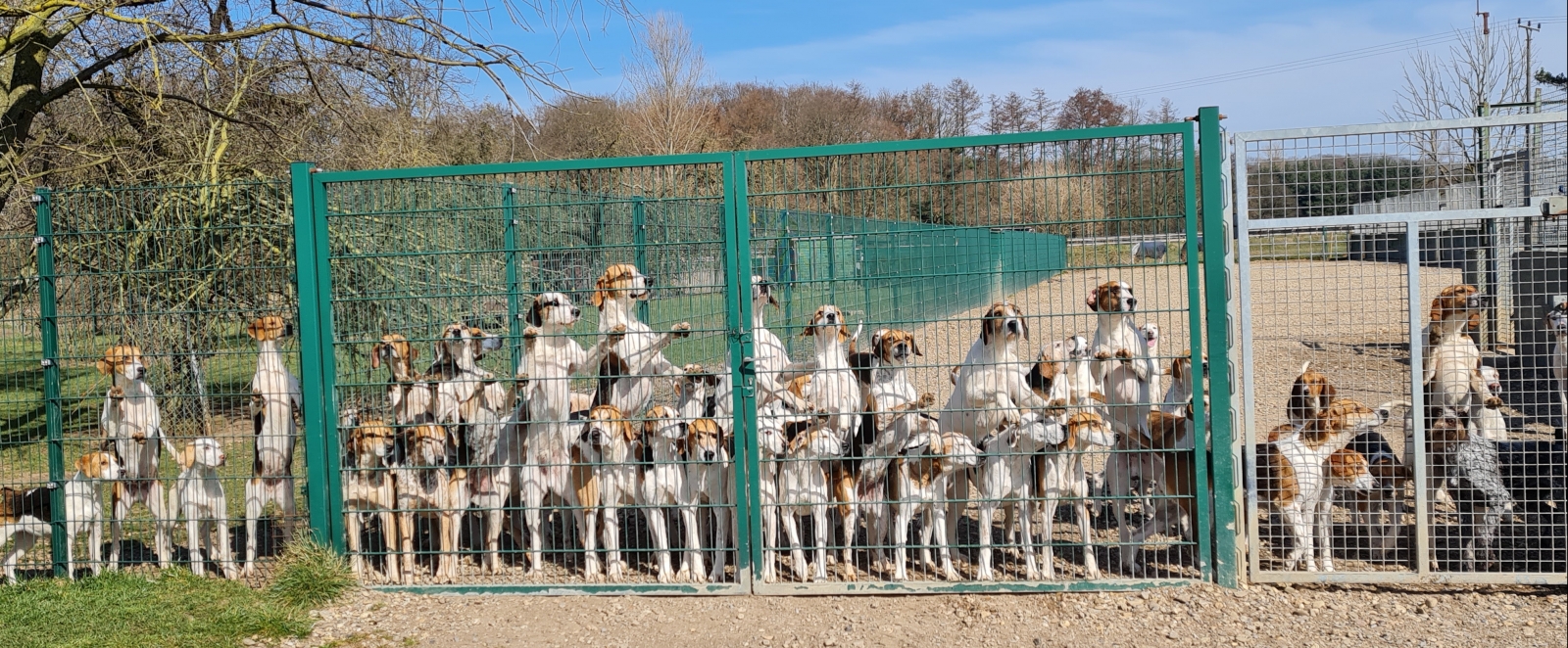 Sehr viele Hunde, weiß mit ein paar großen, braunen und scharzen Flecken stehen nebeneinander an einem grünen Metallzaun. Einige von Ihnen stehen aufrecht mit den Pfoten an den Zaun gelehnt.